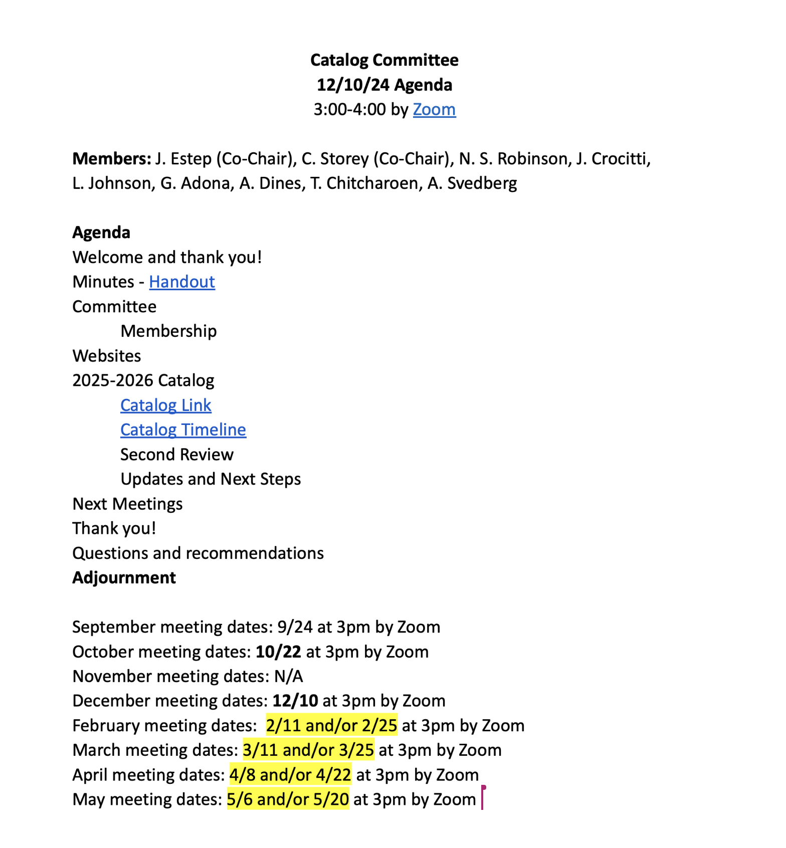 The primary purpose of the Catalog Committee is to coordinate the annual update of the college catalog and to ensure that the contents are accurate, clear, and useful. The Catalog Committee is housed under Academic Senate, is a subcommittee of Curriculum Review Committee, and reports to Instructional Services.