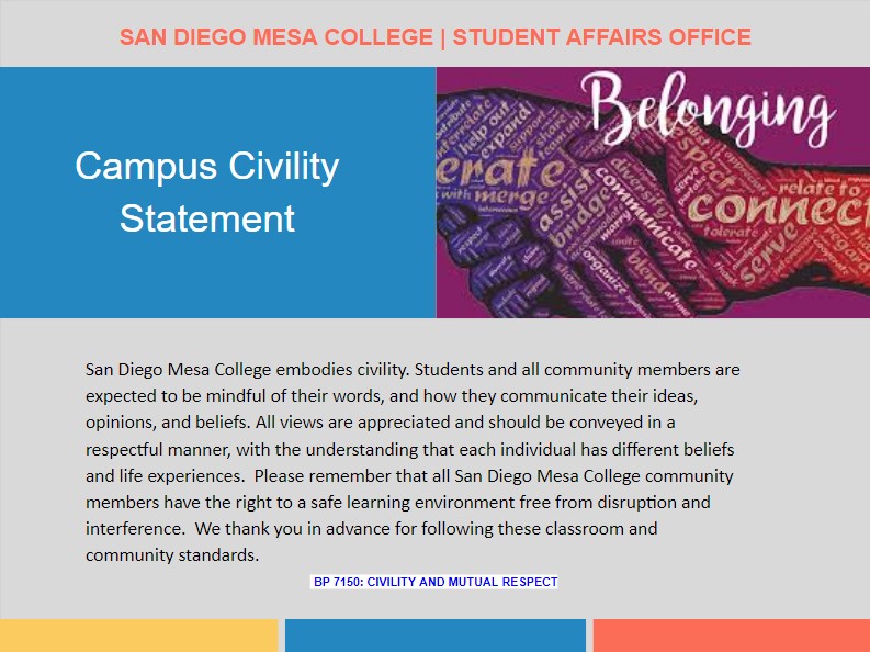 San Diego Mesa College values honesty, academic integrity, and community. Our goal is to guide our students in maintaining academic excellence, in addition to fostering a sense of belonging to our campus. At San Diego Mesa College, students are expected to create their own work in connection with all lecture and laboratory assessments and assignments, and will refrain from copying, cheating, plagiarizing, utilizing outside resources, or any form of academic misconduct. Students will only use external sources when approved by faculty and will properly acknowledge these external sources. We understand our students wish to maintain these community standards; however, failure to follow these community standards will be considered a violation of the Student Code of Conduct under Board Policy 5500 and may result in student disciplinary action. We thank our students in advance for adhering to these community standards.
