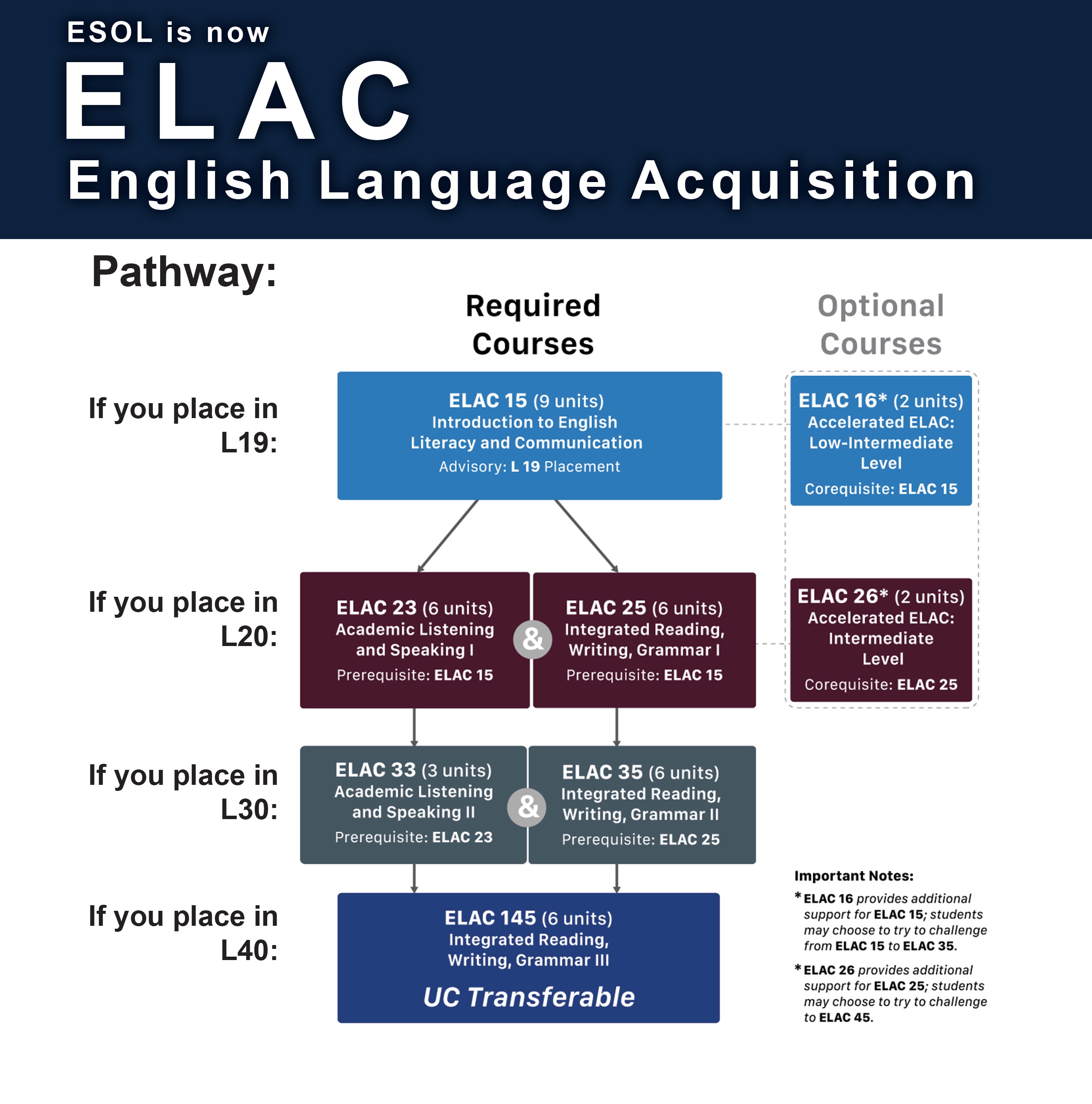 - ELAC (English Language Acquisition, formerly known as ESOL) (L)